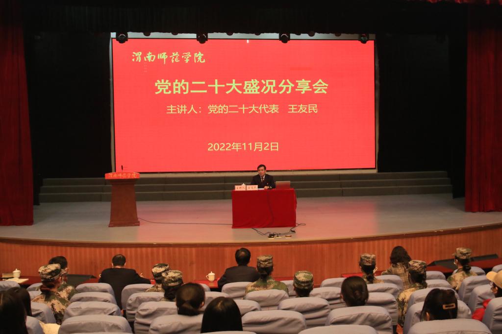 分享会上,王友民同志用生动形象的语言分享了自己参加党的二十大的难忘经历,并结合自身实际畅谈会议期间所见所闻和大会盛况,紧紧围绕党的二十大精神,对习近平总书记在二十大报告中提出的一系列新观点、新论断、新思想、新战略、新要求进行了宏观的阐释和细致的解读。分享的内容既有政策理论高度,又紧密联系实际,为与会师生全面理解和准确把握党的二十大精神,科学谋划下一阶段工作和学习提供了有力指导。