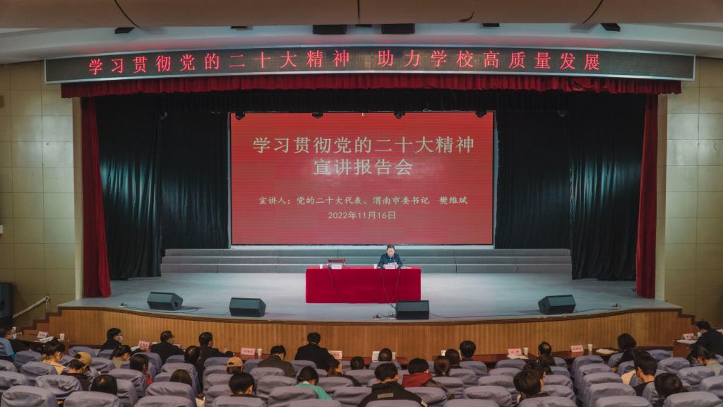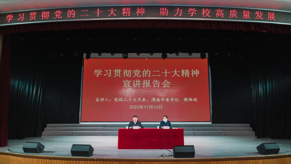 11月16日,党的二十大代表、渭南市委书记樊维斌走进我校为师生代表宣讲党的二十大精神。党委书记卓宇主持报告会。