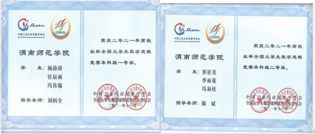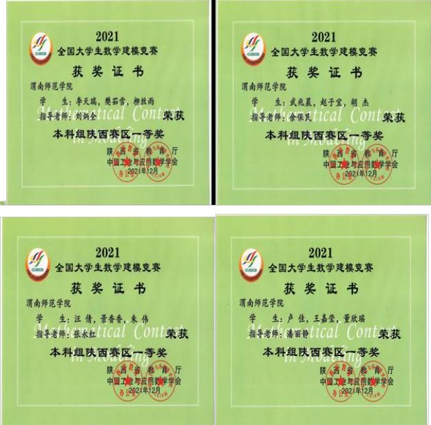 近日,全国大学生数学建模竞赛组委会公布了2022年数学建模竞赛获奖名单,在学校领导的精心指导和大力支持下,经过教务处和数学与统计学院认真组织和培训,数学与统计学院胡旭芳、张培培、孙心宇三位同学组成的参赛队(指导老师董晓萌)喜获全国一等奖,渭南师范学院也再次被评为优秀组织工作奖,这是渭南师范学院从2004年参加该项赛事以来第二次连续获得全国一等奖,此外渭南师范学院学子还获得陕西省一等奖8项、二等奖12项的优异成绩。