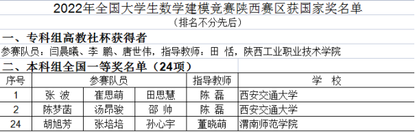 2022年陕西赛区共组织3500余支本科队参赛,共获得全国一等奖24项。渭南师范学院在该项竞赛中已经连续三年荣获国家奖和优秀组织工作奖,作为省内唯一获得国家一等奖的非西安地区的本科院校,对培养大学生数模竞赛的参加热情和积极性起到极大的带动作用,也切实达成了学校应用创新人才培养的总目标,人才培养效果显著,社会声誉和影响力不断提升。(通讯员 段卫国 戴磊 审核人 陈斌)