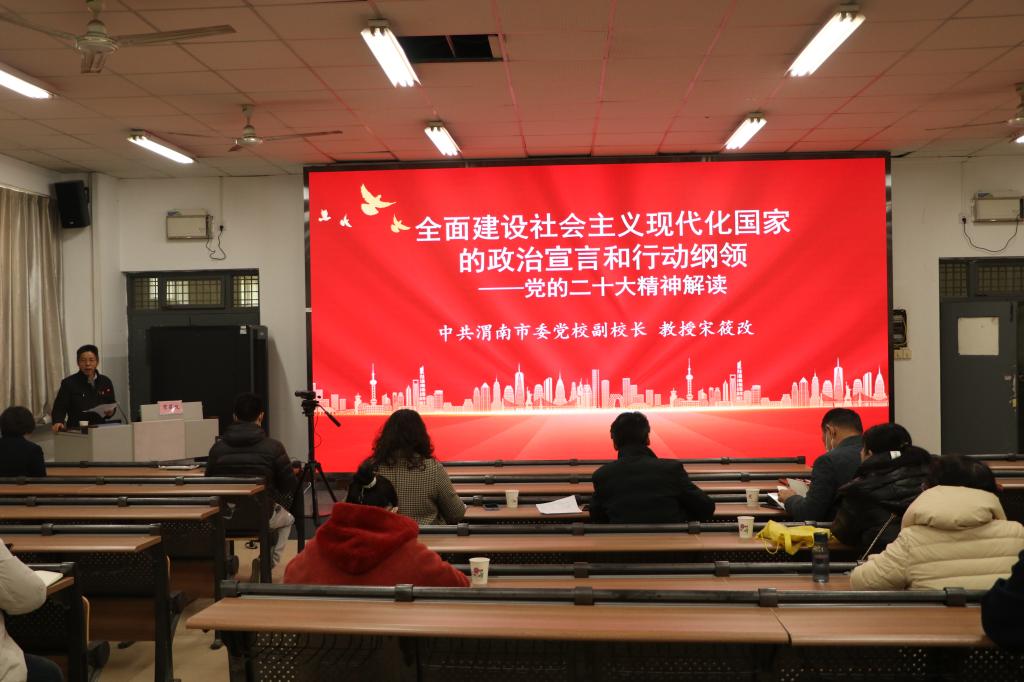 市委宣讲团成员,市委党校副校长宋筱改教授以《全面建设社会主义现代化国家的政治宣言和行动纲领》为题,阐释了党的二十大的重大意义和主要成果,梳理了党的二十大报告的框架结构,系统解读了党的二十大的主要精神。同时,结合渭南实际,结合高等教育特点,提出了学习宣传贯彻党的二十大精神的几点要求。报告历时两个多小时,结构清晰、内容丰富、重点突出。