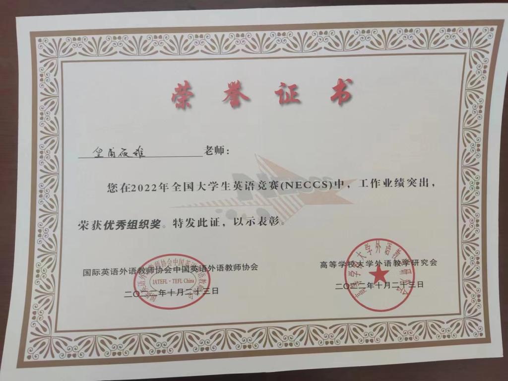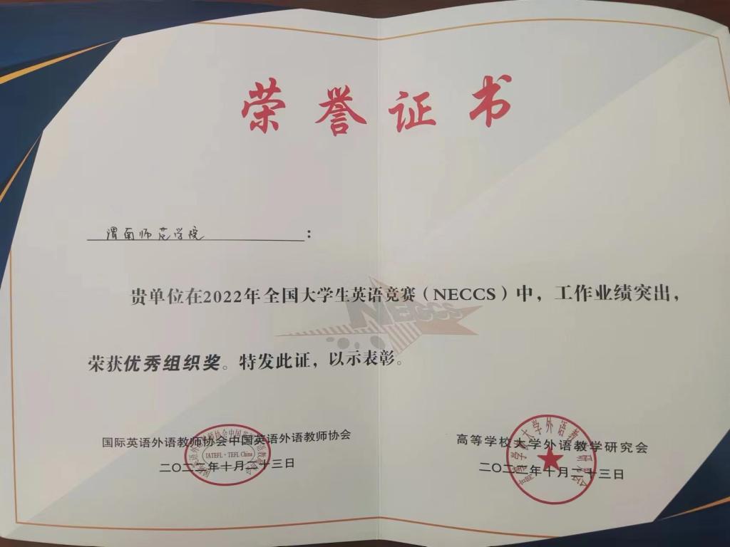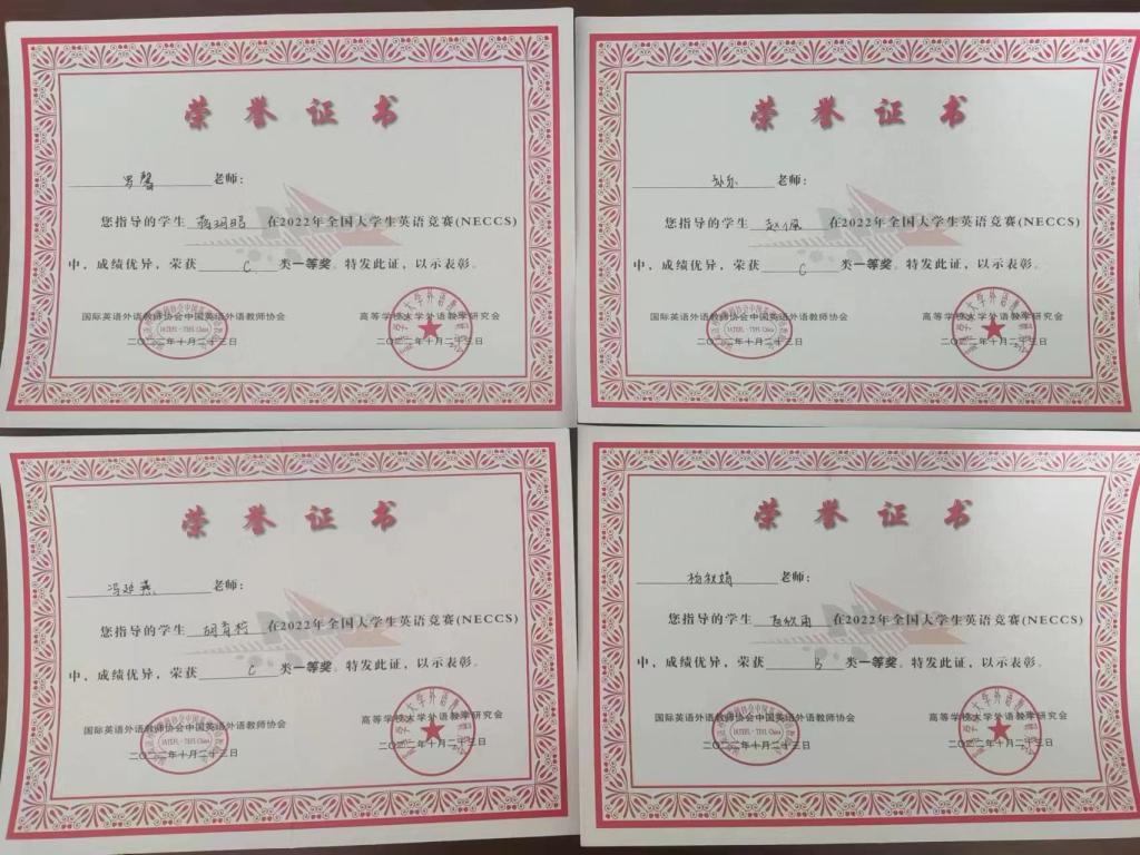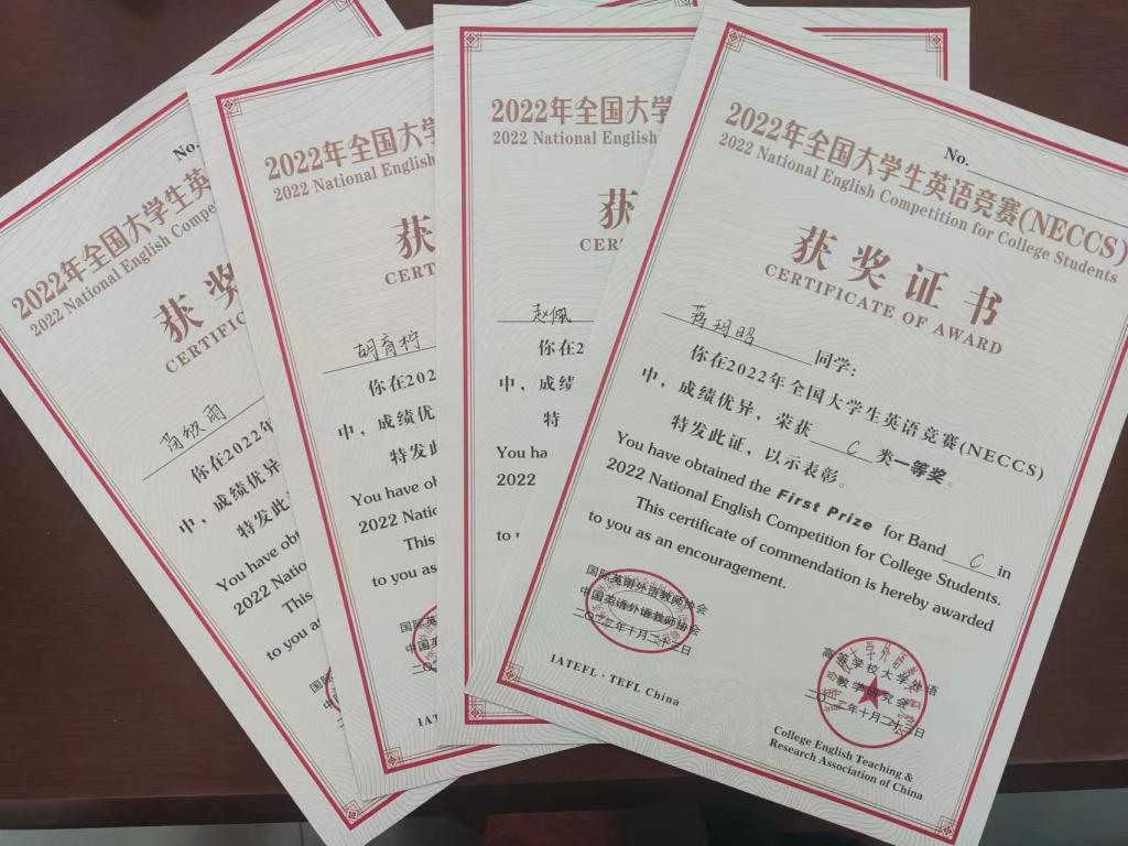 12月13日,2022年全国大学生英语竞赛(NECCS)决赛成绩揭晓,外国语学院苗欣雨同学获得B类一等奖,物理与电气工程学院蒋玥昭、经济与管理学院赵佩、胡育柠等3名学生获得C类一等奖,杨秋娟、孙乐、冯延燕、罗馨等4名教师被评为一等奖优秀指导教师,我校荣获优秀组织奖,皇甫筱雅老师荣获优秀组织个人奖。