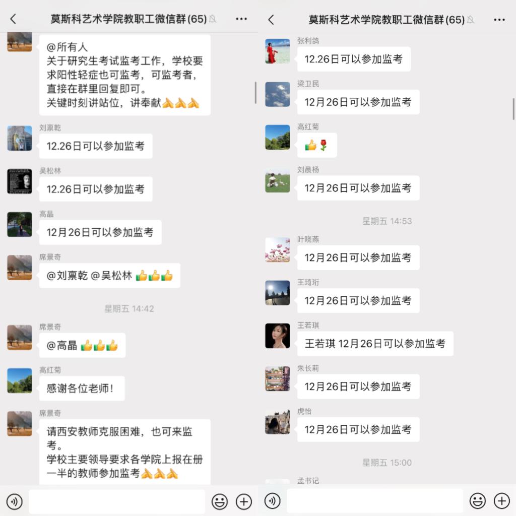 12月23日,莫斯科艺术学院接到研招考任务后,第一时间召开紧急会议,在教职工群招募参加此次考试工作的监考人员,教师纷纷踊跃报名,迅速组成了16人参加的“莫艺研招考战疫先锋队”。