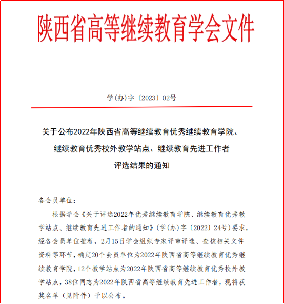 近日,陕西省高等继续教育学会发布《关于公布2022年陕西省高等继续教育优秀继续教育学院、继续教育优秀校外教学站点、继续教育先进工作者评选结果的通知》(学(办)字〔2023〕02号),我校继续教育学院荣获“陕西省高等继续教育优秀继续教育学院”,刘永勤荣获“陕西省高等继续教育先进工作者”。