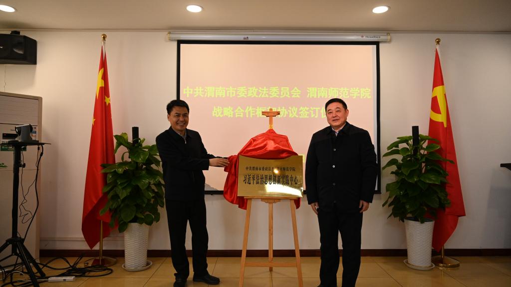 仪式上,渭南市委政法委与我校共同签署了战略合作框架协议,刘凯和卓宇共同为“习近平法治思想创新实践中心”揭牌。
