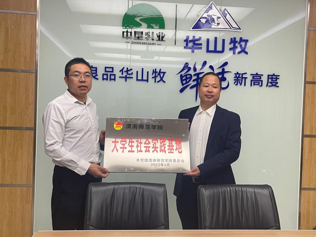 3月8日下午,学校赴中垦华山牧乳业有限公司建立“渭南师范学院大学生社会实践基地”。学校党委副书记汪勇、共青团渭南市委副书记李林、中垦华山牧乳业公司副总经理黄锐、渭南高新区阳曲街道党工委书记李喆参加授牌仪式。