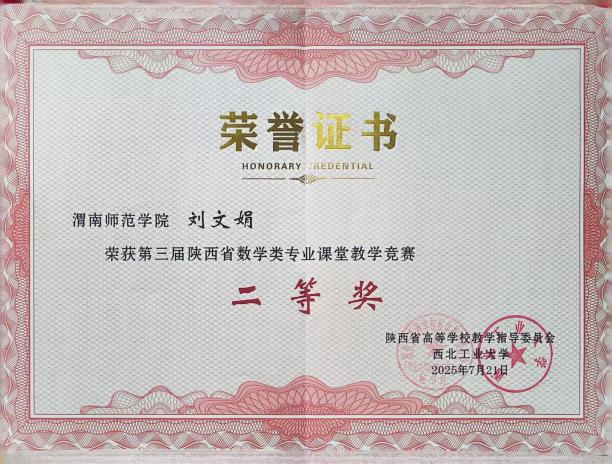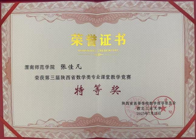 此次获奖不仅是我校教师扎实教学功底与创新教学方法的集中展现,更是我校长期以来坚持推动教学改革、重视青年教师培养的成果体现。竞赛为全省数学教育工作者提供了宝贵的交流平台,有效激发了教师深耕课堂、追求卓越的教学热情,对持续提升数学类专业人才培养质量、推动陕西高校数学教育协同发展具有重要意义。我们将以此为契机,进一步鼓励更多教师投身教学创新,为培养高素质人才贡献更大力量。(通讯员 张佳凡 审核人 戴磊)