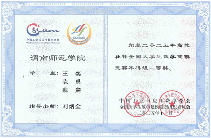 近日,全国大学生数学建模竞赛组委会公布了2025年数学建模竞赛获奖名单,我校学生王奕、陈禹、魏鑫组成的参赛队(指导老师刘炳全)喜获全国二等奖,此外,我校学子还获得陕西省一等奖5项、二等奖14项。