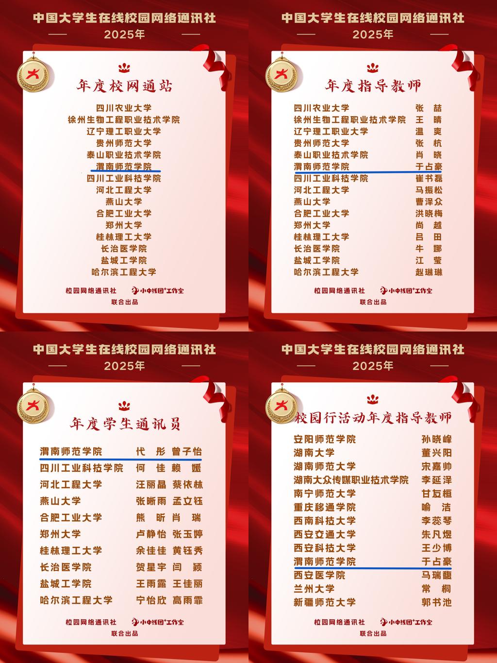 12月25日,教育部中国大学生在线公布2025年度全国表彰名单,我校获评“年度校网通站”,于占豪老师获评“年度指导教师”与“校园行活动年度指导教师”称号,全媒体中心学生记者代彤、曾子怡荣获“年度学生通讯员”称号等4项荣誉。这是中国大学生在线渭南师范学院校园网络通讯站获批建站6年以来首次荣获该类别荣誉,标志着学校网络思政建设与网络文化育人等工作取得了新的成效。