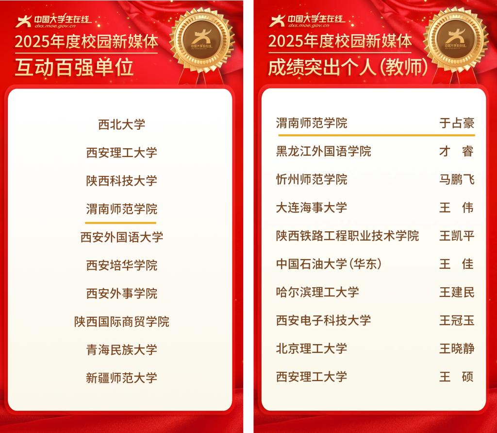 1月8日,教育部中国大学生在线公布2025年度校园新媒体融合共建表彰名单,我校喜获“2025年度校园新媒体互动百强单位”,我校教师于占豪荣获“2025年度校园新媒体成绩突出个人(教师)”。本次表彰,全省高校共荣获35项荣誉,其中新媒体互动百强10家高校,新媒体成绩突出个人(教师)11人。此次表彰,标志着我校新媒体矩阵建设与网络思政育人实践获得国家级平台的充分肯定。