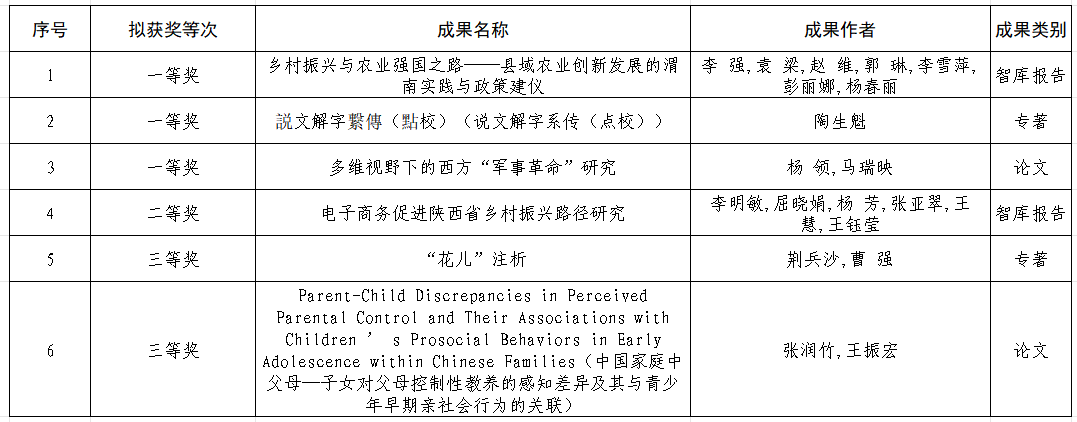 近日,陕西省第十七次哲学社会科学优秀成果奖评选结果揭晓,我校教师团队共斩获5项奖项。其中,智库研究报告获一等奖1项、二等奖1项;学术专著获一等奖1项、三等奖1项;研究论文获三等奖1项。获奖总数及一等奖数量均创下学校参评以来最好成绩。另有1项论文一等奖由我校教师依托外校申报获得。