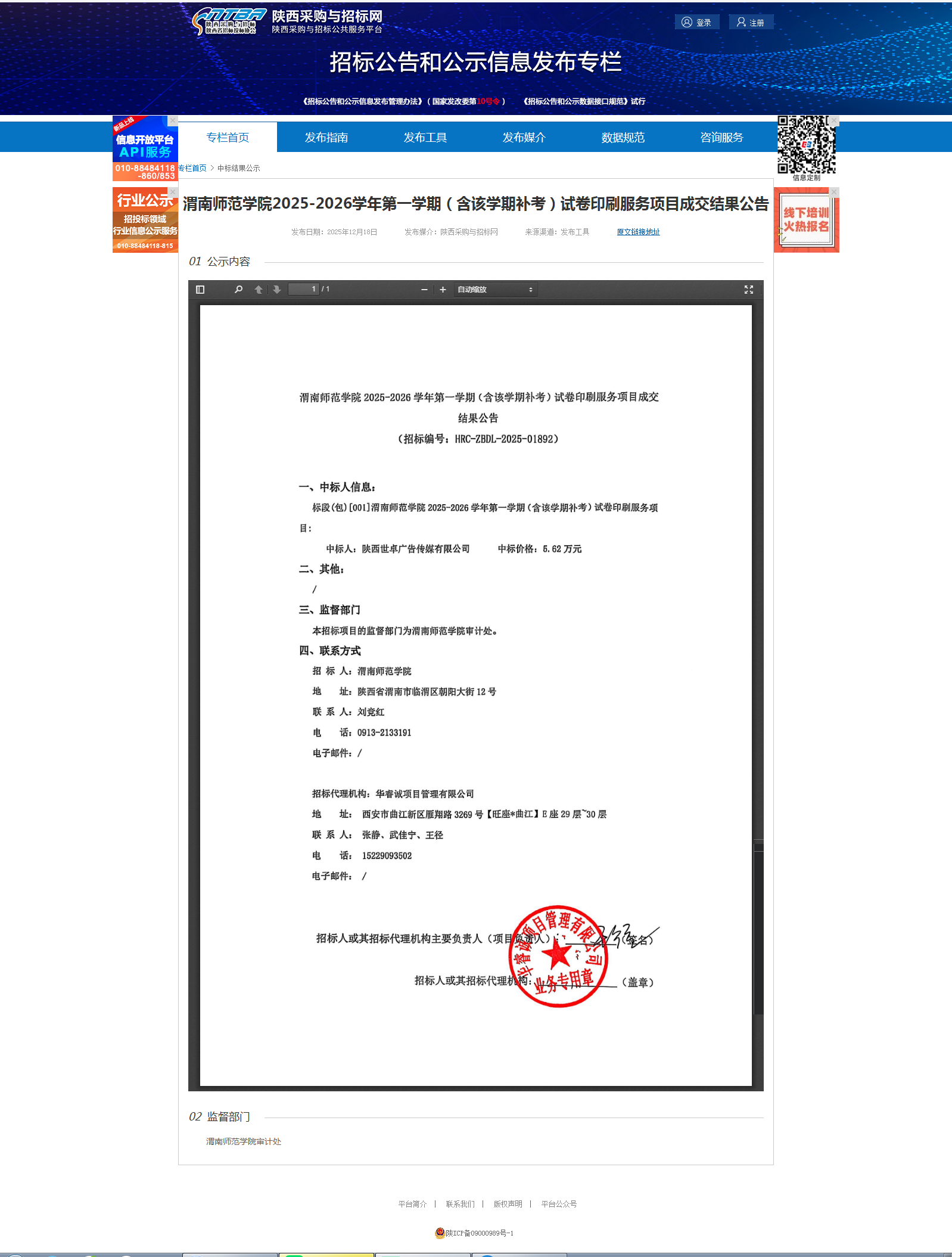 渭南师范学院2025-2026学年第一学期(含该学期补考)试卷印刷服务项目成交结果公告
