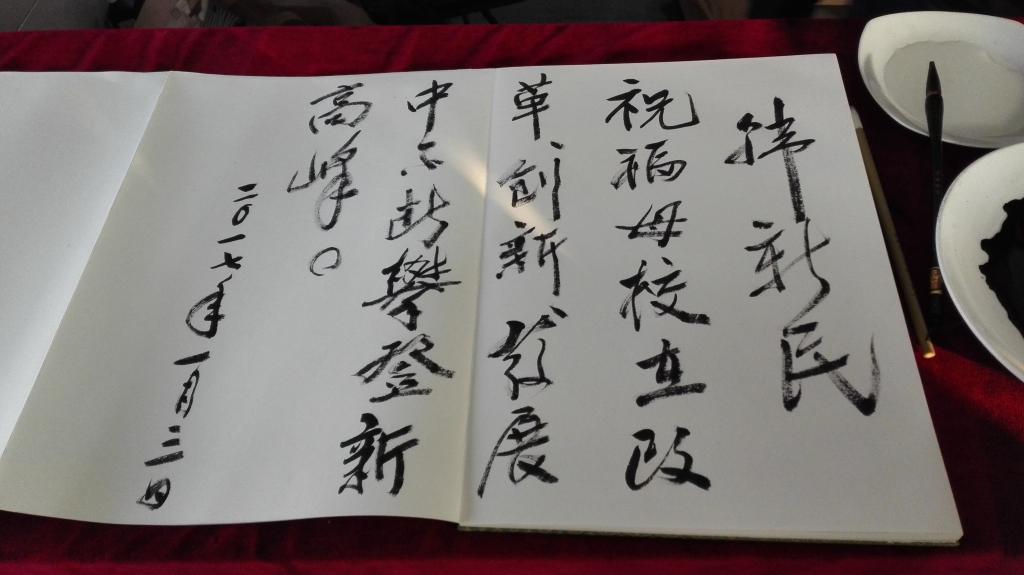 杰出校友代表韩新民在会见中说:感谢母校的盛情邀请,感谢母校的滋养教诲、感谢母校领导的亲切会见。透过这次画展我们切身体会到了母校近年来的巨变,备受鼓舞,异常自豪,期待母校再创辉煌。参观完画展,他饱含深情兴奋地在留言薄上写道:“祝福母校在改革创新发展中不断攀登新高峰”。