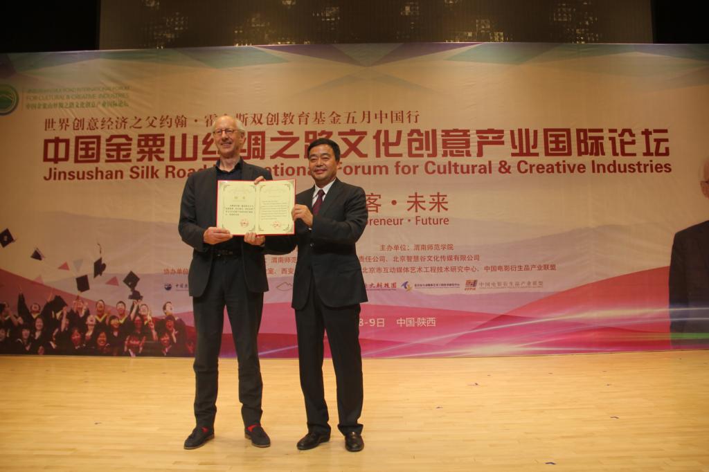 2017年5月8日下午,渭南师范学院在逸夫楼音乐厅举行中国金粟山丝绸之路文化创意产业国际论坛开幕式,开幕式上聘请“世界创意经济之父”约翰•霍金斯先生为我校荣誉教授、校长顾问,陕西省教育与文化创意产业研究院名誉院长、首席科学家。校长丁德科教授为约翰·霍金斯先生颁发了聘书,学术委员会主任委员王菊霞教授为约翰·霍金斯先生授予了礼服。