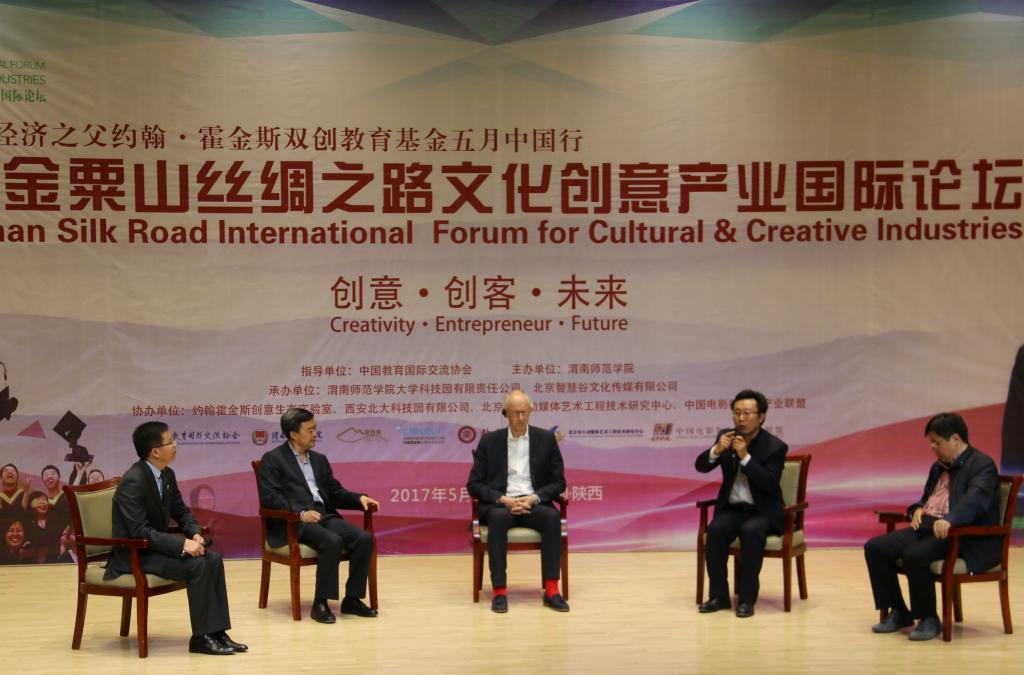 渭南师范学院师生对话“世界创意经济之父”约翰·霍金斯活动是“中国金粟山丝绸之路文化创意产业国际论坛”系列活动之一。此次论坛由教育部中国教育国际交流协会倡导部署、支持指导,渭南师范学院主办,渭南师范学院大学科技园责任有限公司、北京智慧谷文化传媒有限公司承办。