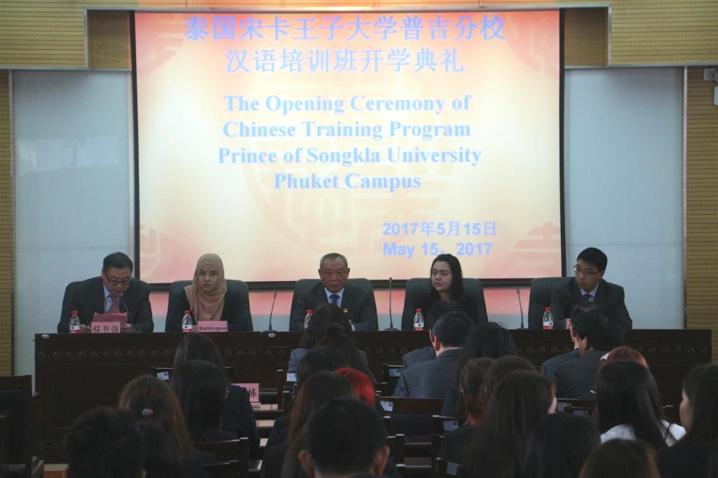 5月15日下午,学校举行泰国宋卡王子大学普吉分校汉语培训班开学典礼。泰国宋卡王子大学普吉分校带队教师Ms. Rattiyapon、教师Ms. Namfon Engchuan,我校党委书记张金安、副院长程书强、校长助理韩小卫、国际合作与交流处处长、教务处处长、汉学院副院长、各二级学院院长和主管教学的副院长等参加典礼。开学典礼由程书强主持。