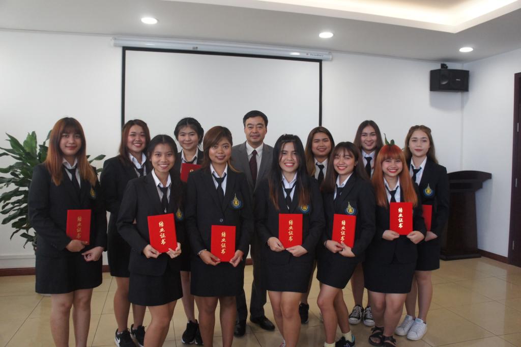 接着,党委书记、院长丁德科教授发表重要讲话。他对泰国留学生们说,“渭南师范学院为你们骄傲,你们是宋卡王子大学的学生,也是渭南师范学院的学生,今后就是我们的校友,欢迎再回学校。”两个月的培训学习,不仅增加两校的友谊,而且增加了中泰两国人民的情谊。他希望宋卡王子大学普吉分校的学子能够再次来到中国,更深地了解中华文化;希望他们能秉承学校精神,快乐幸福生活。讲话最后,大家一起用泰语高喊“友谊万岁”。随后,我校党委书记、院长丁德科教授以及副院长李海龙教授、院长助理韩小卫教授为33名泰国宋卡王子大学普吉分校汉语培训班学员颁发了结业证书,并为优秀学生李兰、陈文丽、艾琳、尚伟德颁发了奖品国画。