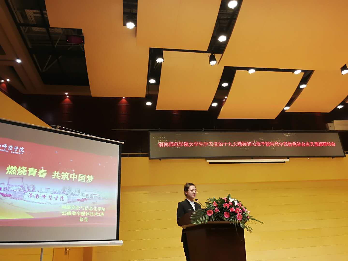 其他学生代表分别以《燃烧青春 共筑中国梦》《不忘初心 立志教育 三尺讲台铸辉煌》《牢记总书记的嘱托 努力奋进新时代》《心中有信仰 奋斗有目标》《新时代扬帆新征程》《立足初心使命放飞青春梦想》《2017筑梦不息,2018执梦前行》等为题进行了精彩发言,在发言中表达了同学们对党的十九大精神和习近平新时代中国特色社会主义思想的深刻理解,表现了同学们用实际行动践行新时代中国特色社会主义思想的决心,也展现出了我校新时代大学生的理论水平与个人风采。