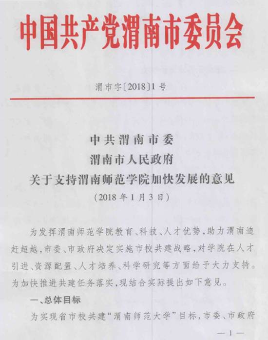 2018年1月3日,中共渭南市委、渭南市人民政府印发了《关于支持渭南师范学院加快发展的意见》(以下简称《意见》),决定实施市校共建战略,对我校在人才引进、资源配置、人才培养、科学研究等方面予以大力支持,支持我校筹建“渭南师范大学”。