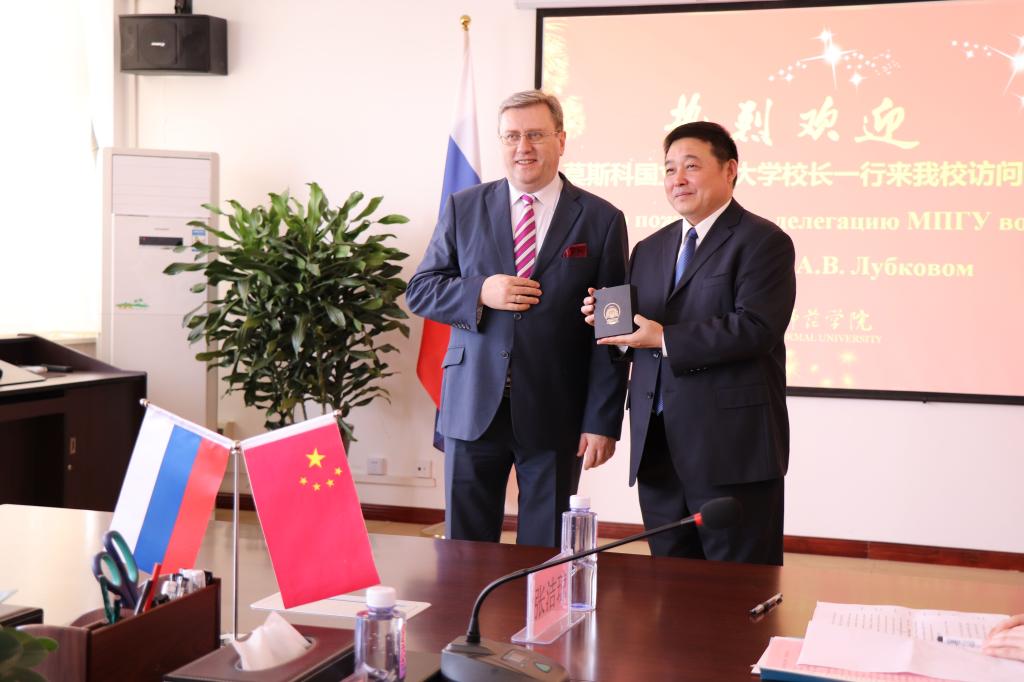 我校党委书记丁德科、院长卓宇、副院长李海龙、莫斯科艺术学院联合管理委员会副主任魏新民及有关部门负责人在厚德楼四楼会议室会见了莫师大校长一行。丁德科向鲁博科夫校长赠送我校纪念校徽,卓宇向来访五人赠送书法作品。鲁博科夫校长向丁书记、卓院长赠送了莫师大纪念校徽和俄罗斯特色乐器三角琴。两校领导对合作办学充满信心,希望两校友谊长存。