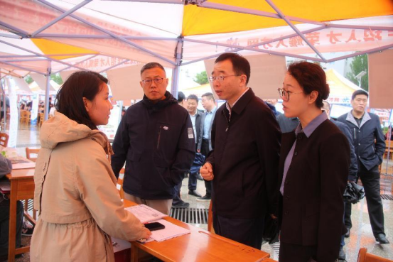我校校长、党委副书记张守华,党委副书记、纪委书记、监察专员肖耀刚,党委副书记袁亮,党委委员、副校长常青林,渭南市人力资源和社会保障局党组成员、副局长董建明,渭南市公共就业和人才交流服务中心主任马会斌等领导亲临招聘会现场指导,与用人单位、参会学生亲切交谈。张守华向来校招聘的单位表示欢迎,对返校招聘的往届校友表示感谢,对应聘的毕业生表示勉励,希望学校与各单位加强联系与协作,进一步完善校地、校企合作机制,为学生搭建良好的就业、实践平台,为企事业单位发展提供优质人才资源。