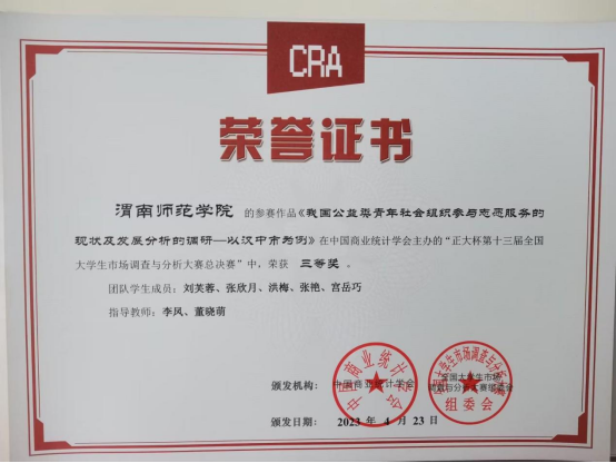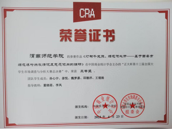至此,数学与统计学院学生在第十三届全国大学市场调查与分析大赛中,共获得本科组国家二等奖1项、国家三等奖3项、陕西省一等奖4项、陕西省二等奖3项,创该院此项赛事获奖数量及质量新高。