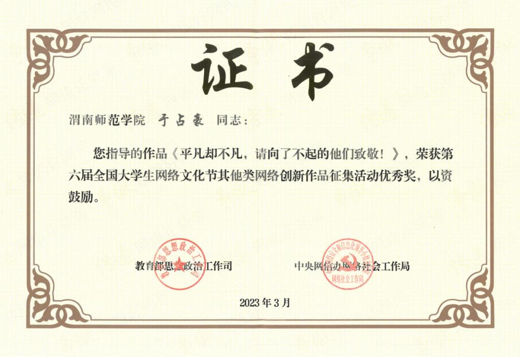 近日,在教育部思想政治工作司、中央网信办网络社会工作局联合主办的第六届全国大学生网络文化节活动中,我校官微推文参选作品《平凡却不凡,请向他们致敬》荣获“其他类网络创新作品”优秀奖,这是我校两次参加全国大学生网络文化节活动以来,首次荣获该类奖项。