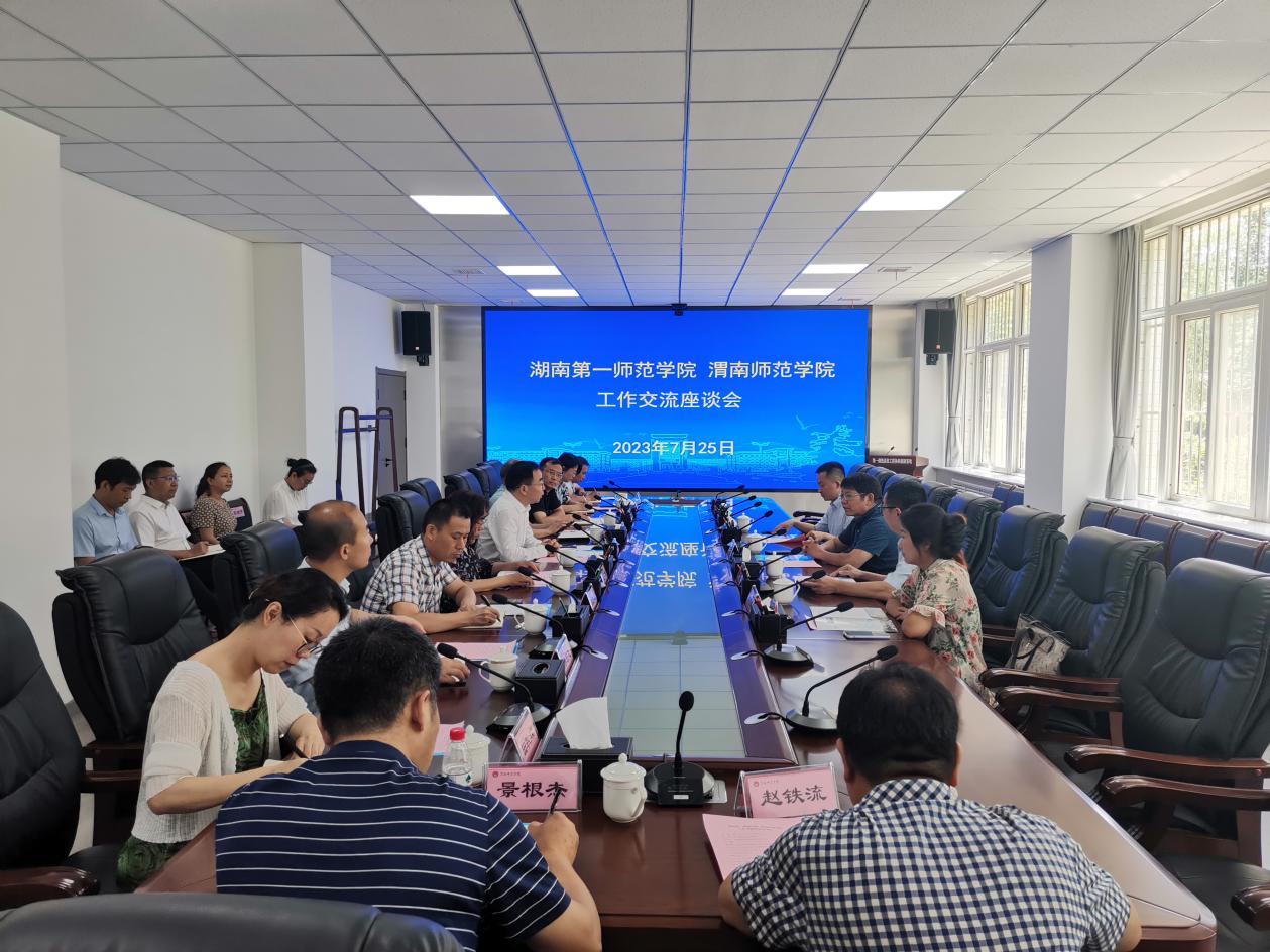 7月25日,湖南第一师范学院党委书记罗成翼、教学质量监控与教师发展中心主任廖小芒、党政办副主任李程等一行4人来我校考察交流。座谈会在同心楼一楼会议室召开,校长张守华、副校长卢爱刚、王菊霞、曹强出席会议,会议由张守华主持。