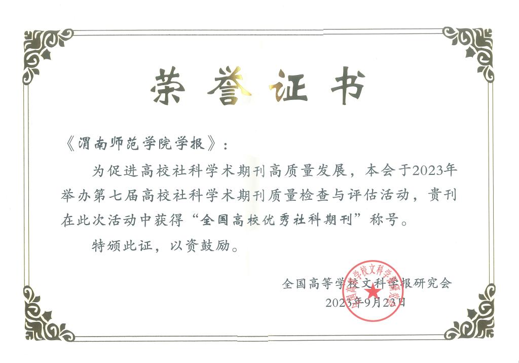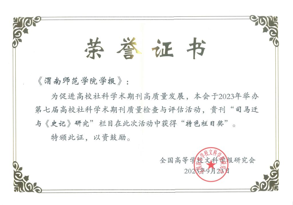 我校学报编辑部在此次评估活动中获得多项荣誉。《渭南师范学院学报》获得“全国高校优秀社科期刊”称号,已入选教育部名栏工程的特色栏目“司马迁与《史记》研究”获得“特色栏目奖”。牛怀岗编审在学报编辑界从业30年,为学术期刊发展做出了突出贡献,被授予“玉笔奖”。朱正平编审的作品《热烈庆祝二十大胜利召开》在全国高校文科学报研究会“学习宣传党的二十大精神”书画、摄影作品展中展出,获得了业界的一致好评。(通讯员 马俊 审核人 詹歆睿 )