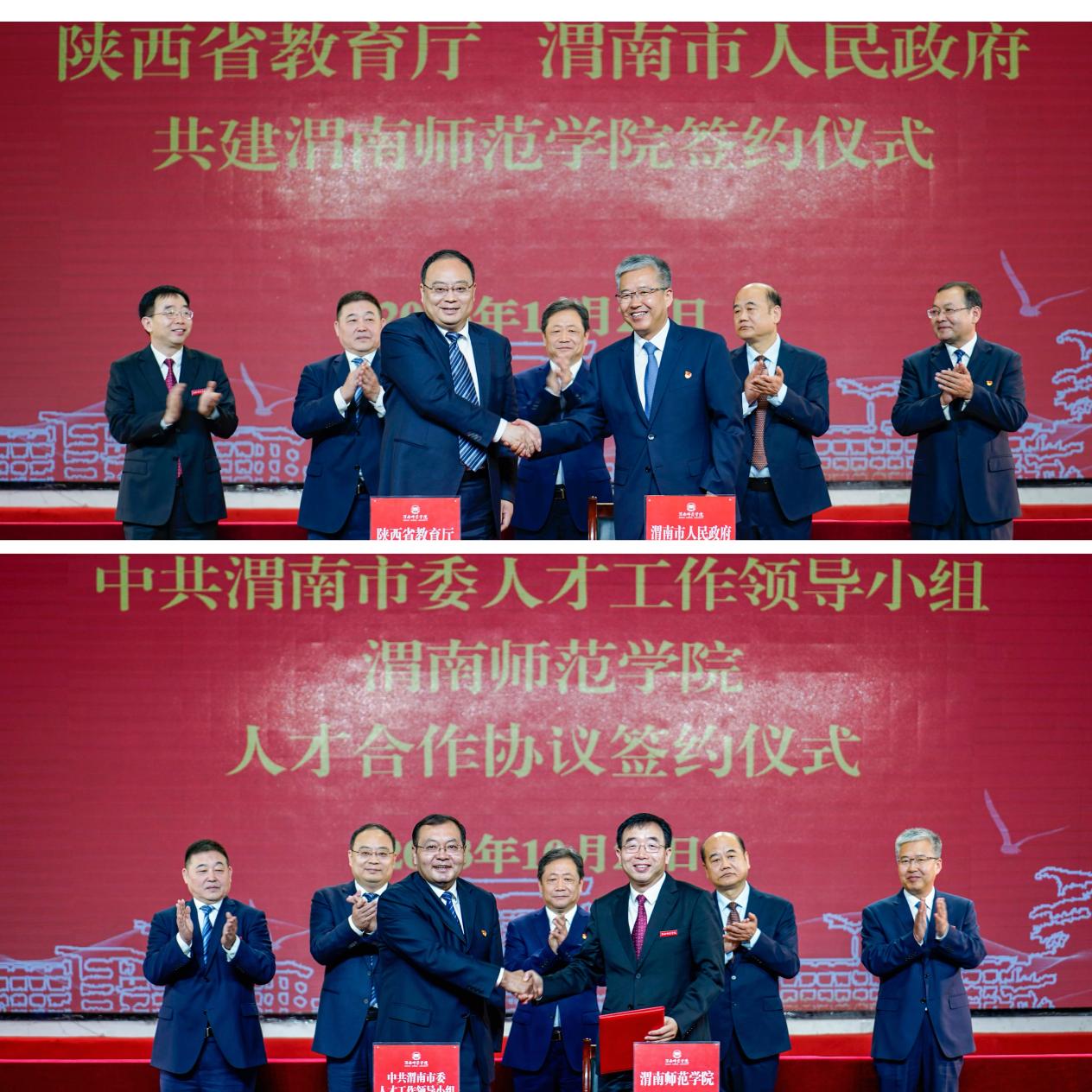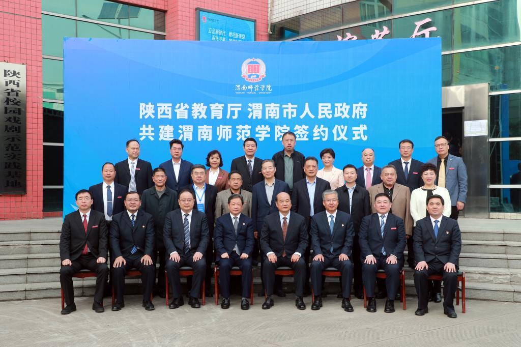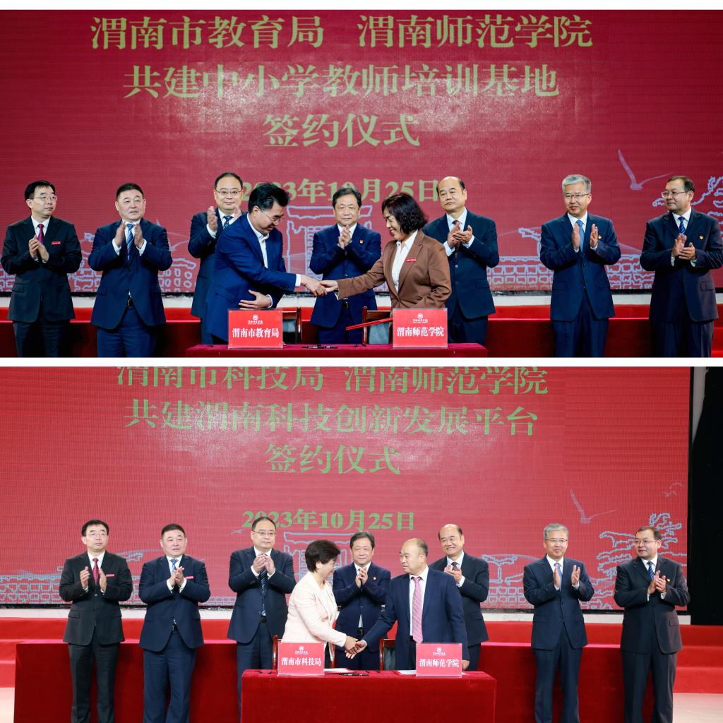 仪式上,王树声、陈晓勇代表双方签署《陕西省教育厅渭南市人民政府共建渭南师范学院协议书》。高振鑫、张守华代表双方签署《渭南师范学院中共渭南市委人才工作领导小组人才合作协议》。渭南市教育局局长雷立新、渭南师范学院副校长王菊霞代表双方签署《渭南市教育局渭南师范学院共建“渭南市中小学教师培训基地”合作协议》。渭南市科技局局长陈改萍、渭南师范学院副校长卢爱刚代表双方签署《渭南市科学技术局渭南师范学院共建渭南科技创新发展平台合作协议》。