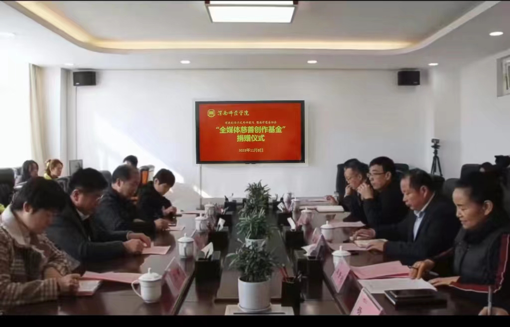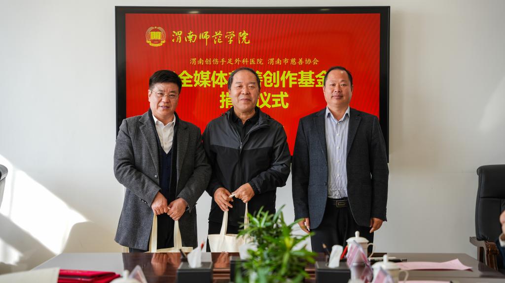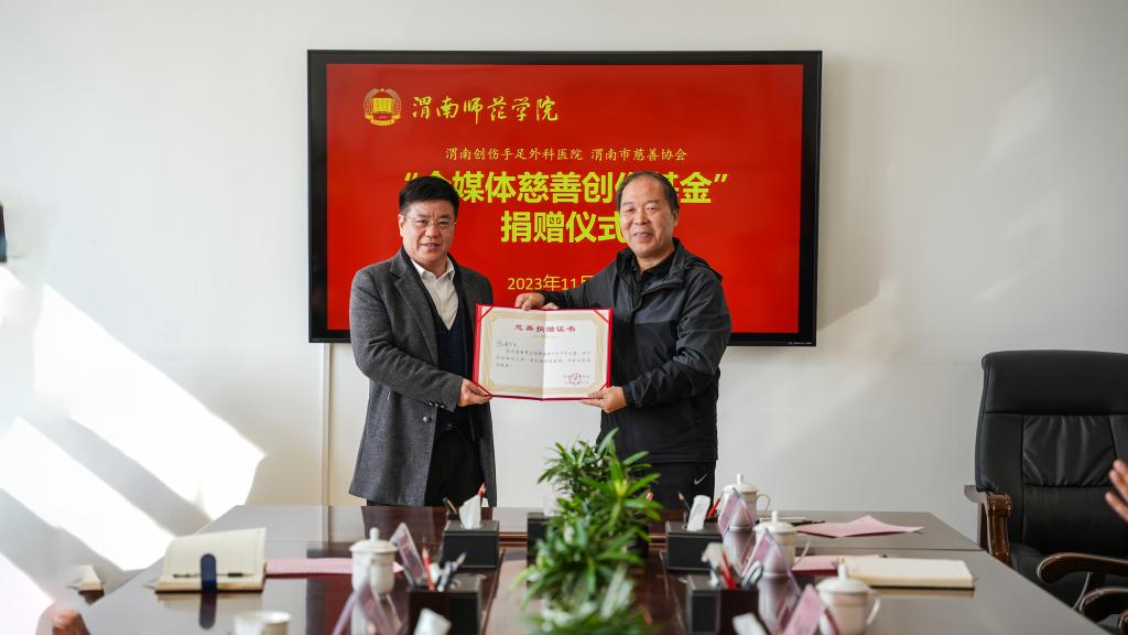 11月8日正值第24个中国记者节,由渭南创伤手足外科医院发起,渭南市慈善协会管理,主要面向我校全媒体中心师生记者的“全媒体慈善创作基金”捐赠仪式在厚德楼第一会议室举行。渭南创伤手足外科医院院长陈锋、渭南市慈善协会副会长林跃、渭南日报社新闻研究室主任张晓玲,我校党委副书记韩小卫、汪勇,党委委员、宣传部部长李明敏,宣传部副部长朱芳转以及20余名师生记者代表参加了仪式。