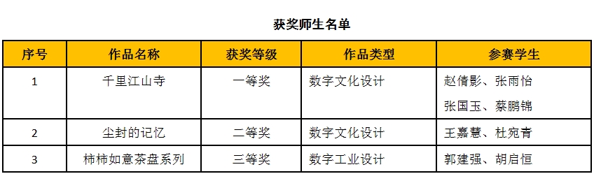 经过校赛和省赛选拔,传媒学院动画专业赵倩影、张雨怡、张国玉、蔡鹏锦同学创作的数字作品《千里江山寺》荣膺一等奖;王嘉慧、杜宛青同学凭借动画短片《尘封的记忆》荣获二等奖;郭建强、胡启恒同学创作的数字工业设计作品《柿柿如意茶盘系列》则荣获三等奖。