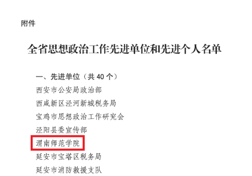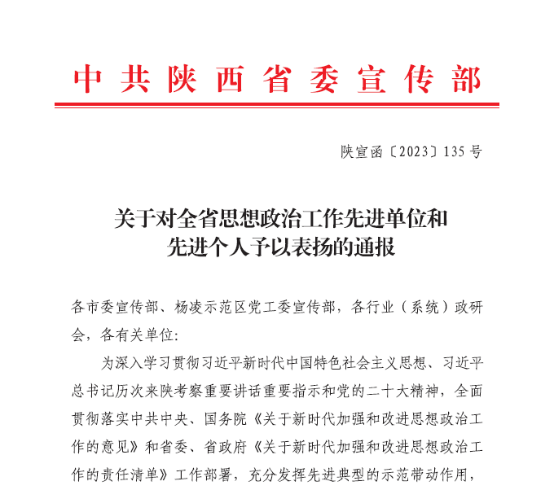 近日,中共陕西省委宣传部印发《关于对全省思想政治工作先进单位和先进个人予以表扬的通报》(陕宣函〔2023〕135号),我校荣获“全省思想政治工作先进单位”称号。此次共表彰40个先进单位,其中全省5所高校获此殊荣,我校位列其中。
