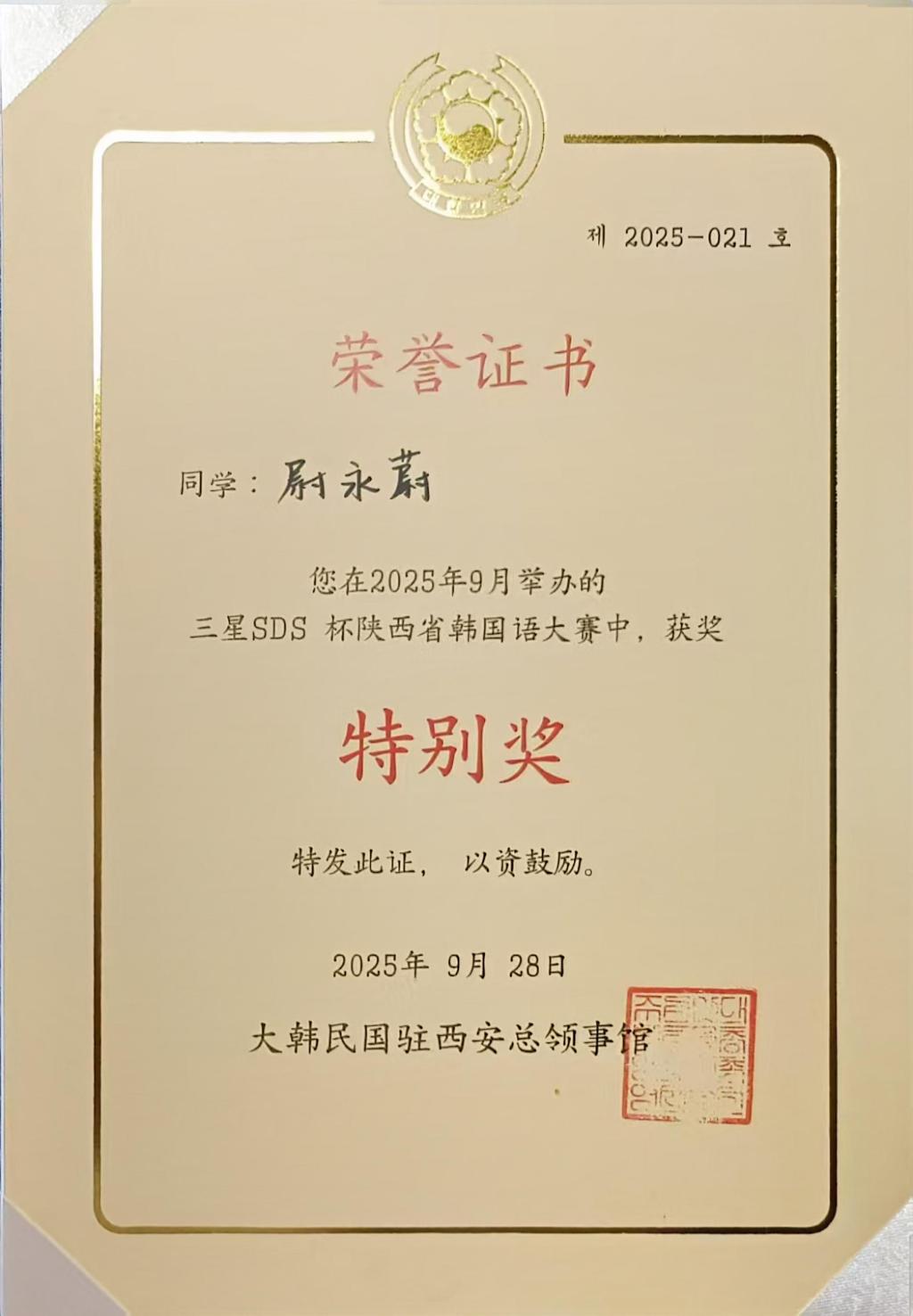 来自省内多所高校的15名选手脱颖而出,晋级个人赛决赛。在当天的比赛中,我校朝鲜语专业学生尉永蔚作为首位出场选手,沉着应战,以稳健的台风、流畅的表达和富有感染力的表现赢得了评委们的高度认可。经过主题演讲和Free Talking两轮比拼,尉永蔚同学发挥出色,一举夺得由大韩民国驻西安总领事馆为本届大赛特设的唯一奖项——领事特别奖,展现了我校学子的优秀语言素养与综合能力。