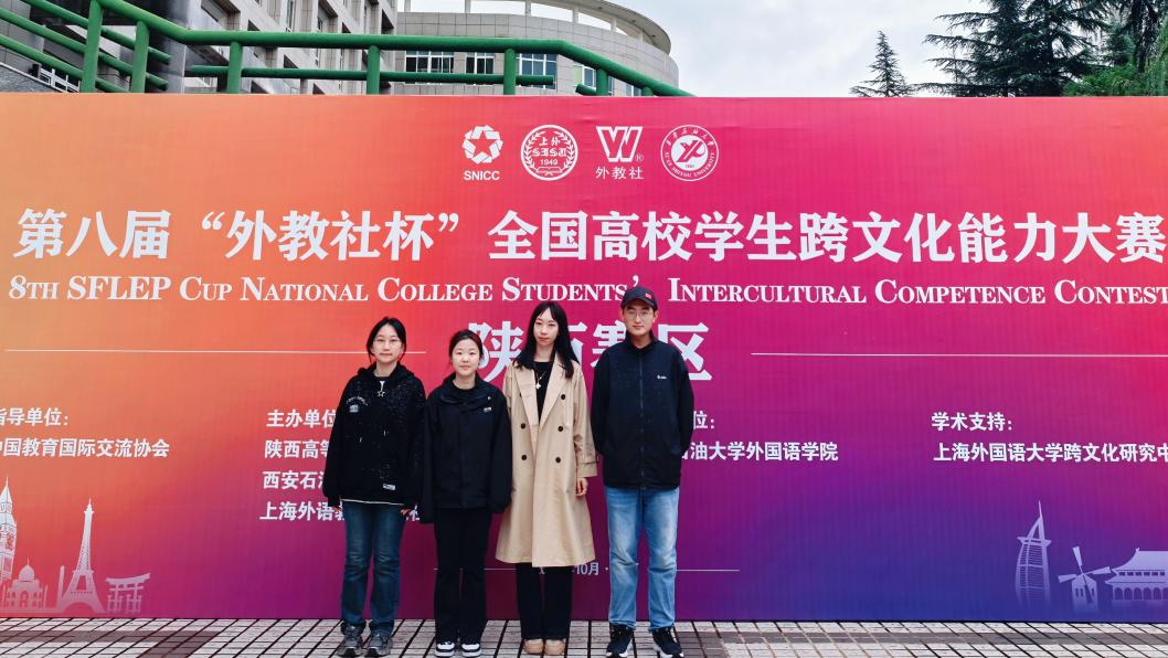 10月19日,第八届“外教社杯”全国高校学生跨文化能力大赛陕西赛区比赛在西安石油大学圆满落幕。我校派出由外国语学院郝嘉亮、卢峰、孙莹三位教师共同指导,外国语学院学生崔雨涵与人文学院学生折宏宇、曾玉婷联合组成团队。该团队凭借扎实的跨文化知识、出色的沟通技巧及默契的团队协作在比赛中荣获省级二等奖。