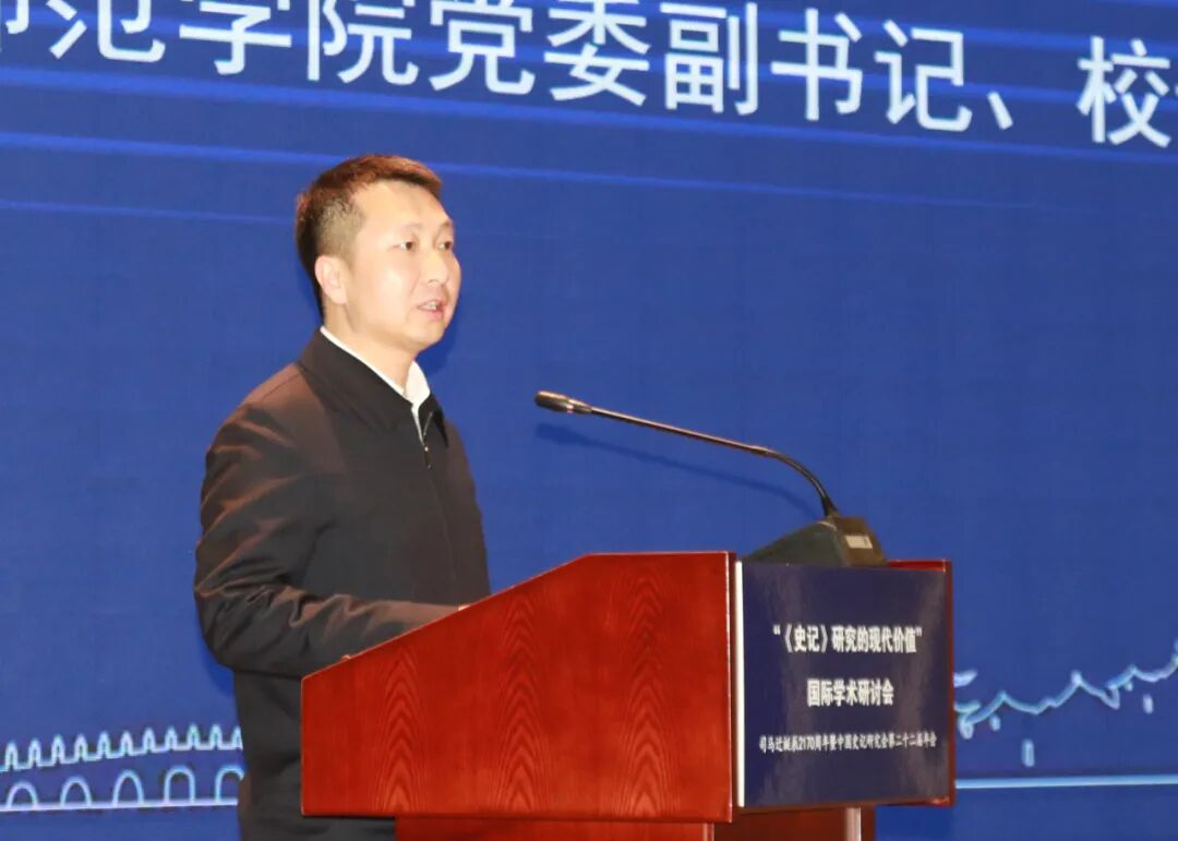 李强代表渭南师范学院对与会领导及海内外专家学者表示热烈欢迎。李强介绍了学校的发展历程和办学成果。李强指出,学校《史记》研究已经开展了40多年,获批省部级以上项目50余项,出版专著60余部,发表论文300余篇,成果总字数近2000万字。李强表示,年会以“《史记》研究的现代价值”为主题,紧扣时代脉搏,是传统与现代的激情碰撞,通过感悟司马迁伟大的人格精神与《史记》伟大的文化力量,充分发掘传统文化中的宝贵资源,对赓续中华文脉、推动以《史记》为代表的中华优秀传统文化的创造性转化和创新性发展、发掘《史记》的世界意义等方面将产生积极而深远的影响。