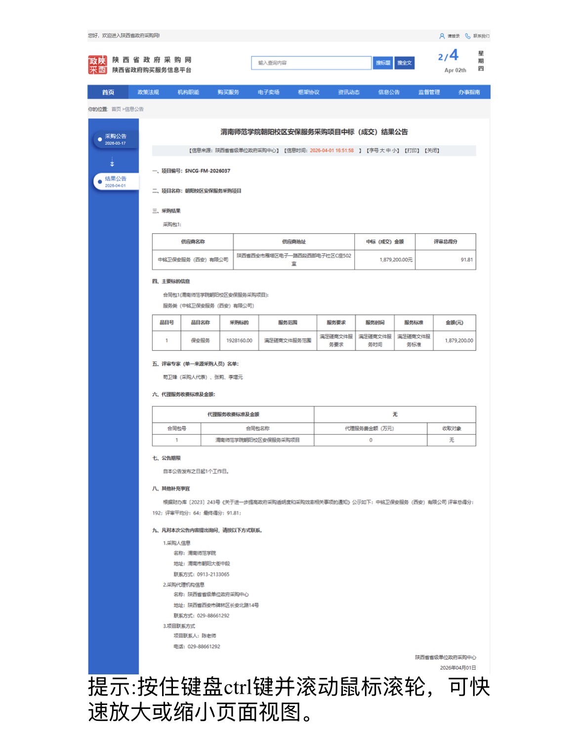 渭南师范学院朝阳校区安保服务采购项目中标(成交)结果公告